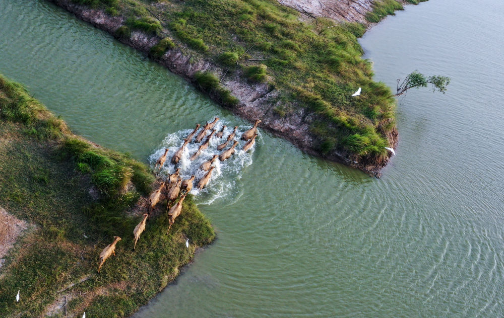 一群麋鹿在江苏大丰麋鹿国家级自然保护区野鹿荡渡河(无人机照片,8月20日摄)。