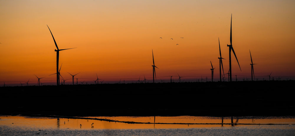 落日时分拍摄的东台沿海经济区风力发电机组(无人机照片,8月31日摄)。