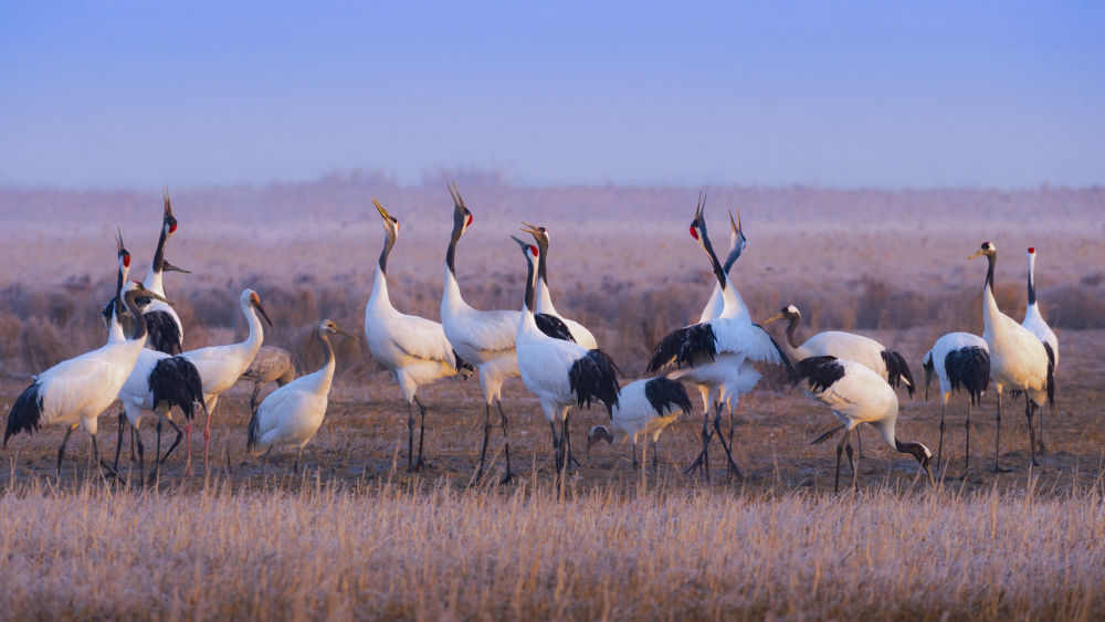 丹顶鹤等栖息在江苏盐城湿地珍禽国家级自然保护区。