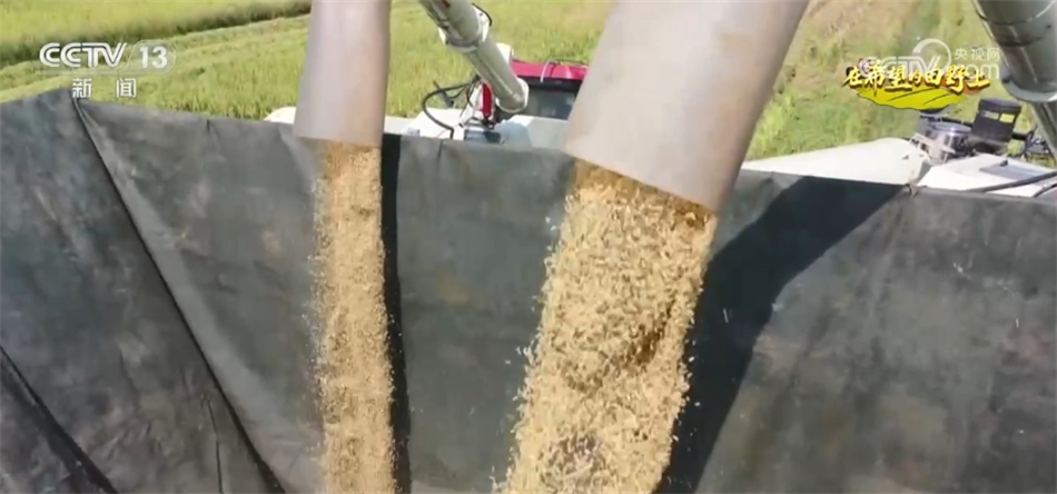 在宜春高安市上湖乡上湖村,大面积水稻也正在收割中,机械化作业提高了效率,一株株水稻脱粒后,从收割机仓门倾泻而下。