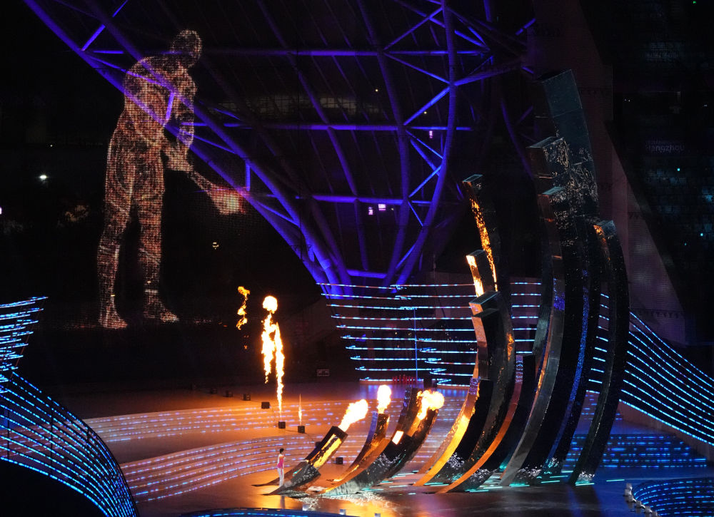 9月23日,火炬手汪顺和数字火炬手在开幕式上点燃主火炬。新华社记者 江文耀 摄