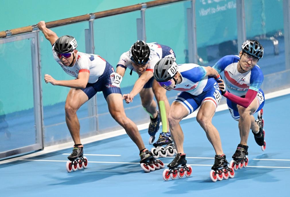 这是杭州亚运会赛场上最戏剧性的一幕:男子速度轮滑3000米接力赛的终点线前,以为自己已经获胜的韩国队员因为提前庆祝振臂欢呼,被中国台北队选手以0.01秒极限反超,丢掉了金牌。