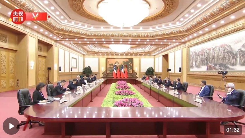 10月17日上午,国家主席习近平在人民大会堂同来华出席第三届“一带一路”国际合作高峰论坛并进行国事访问的智利总统博里奇举行会谈。