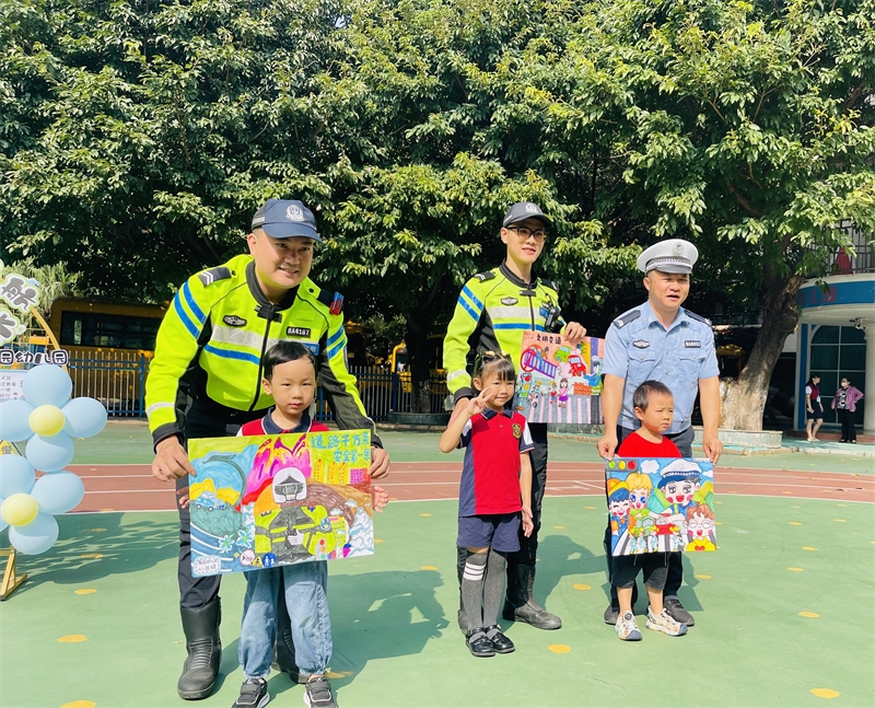 活动中,宣讲民警结合幼儿园小朋友年龄和心理特点,用通俗易懂的语言向小朋友们讲解了交通信号灯、交通标志等的不同含义,传授了怎样安全通过马路、如何正确佩戴安全头盔、怎样安全乘车以及乘车规范等交通安全知识。为了巩固小朋友们所学的交通安全知识,宣讲民警通过趣味问答,模拟交通小游戏等方式寓教于乐,并重点对“一盔一带”中安全头盔和安全带的使用方法进行了详细讲解,希望培养小朋友们从小自觉遵守交通法律法规的意识,引导他们养成安全文明出行习惯。活动结束时,小朋友们将学校40多位小画家共同创作的“民警肖像画”拿出并送给宣讲民警。小朋友们表示,这场活动非常有趣,回家后要跟父母、兄弟姐妹一起分享今天学到的交通安全知识。