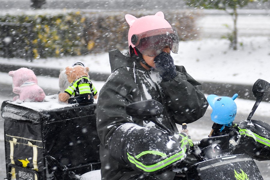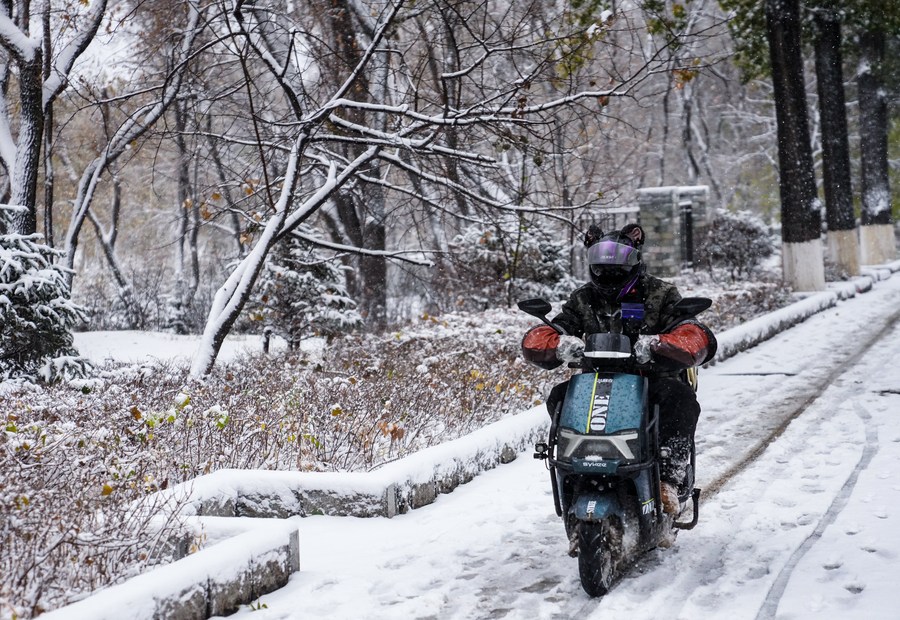 11月6日,在长春市街头,一名外卖员在雪中骑行。新华社记者 许畅 摄
