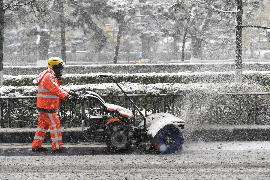 11月6日,在长春市人民大街,环卫工人操作清雪机清理路面积雪。新华社记者 张楠 摄