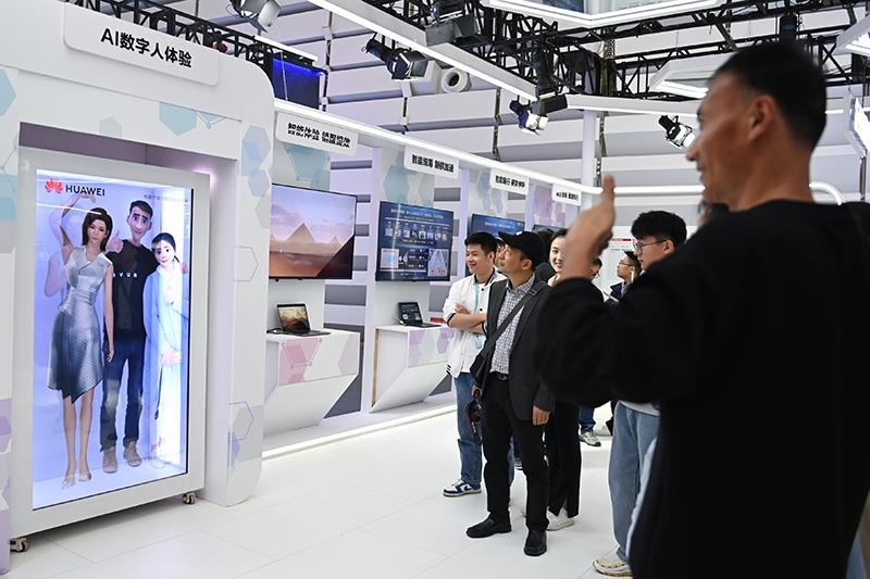 △2023年11月7日,2023年世界互联网大会“互联网之光”博览会在浙江乌镇开幕。图为观众在展台体验与AI数字人合影。