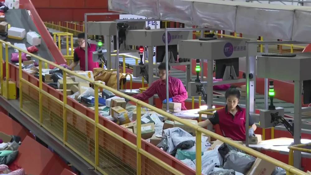 圆通速递北方总部基地内工作人员正在紧张工作。(视频截图)