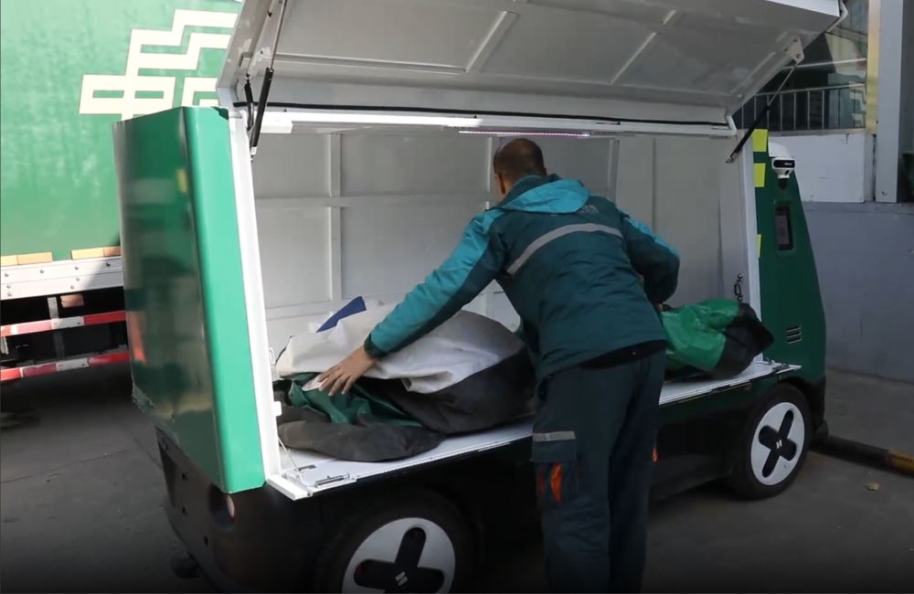 11月2日,山西阳泉的邮政快递员将货物装进无人配送车中。新华社记者 解园 摄
