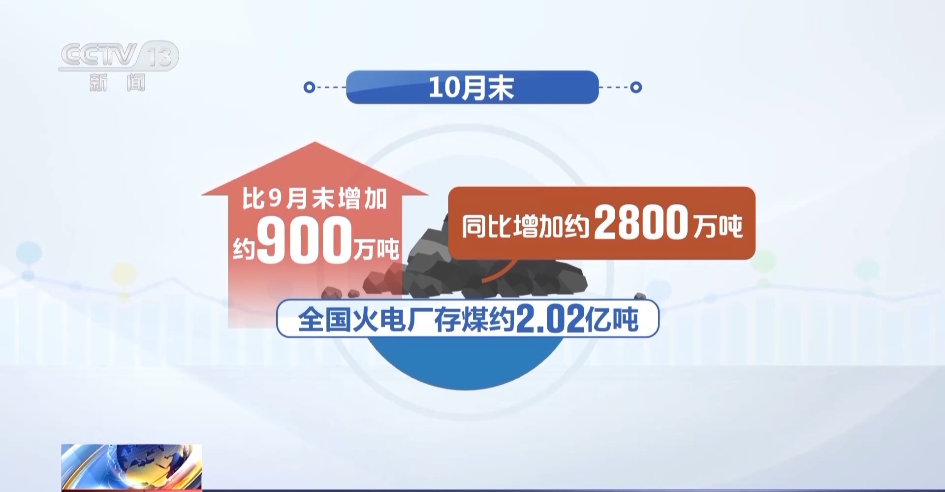 中国煤炭工业协会数据显示:10月末,全国火电厂存煤约2.02亿吨,比9月末增加约900万吨、同比增加约2800万吨,存煤可用约34天,存煤创历史新高。