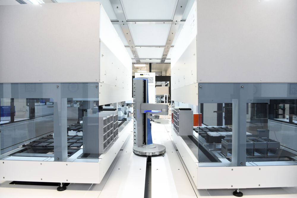 在一个个透明的功能岛里,机械臂正熟练地把多个生物试剂和样品准确地放进微孔板,自动化小车在各个功能岛之间来往运送实验用品,一个智能化的“生命铸造工厂”井然有序地运转。