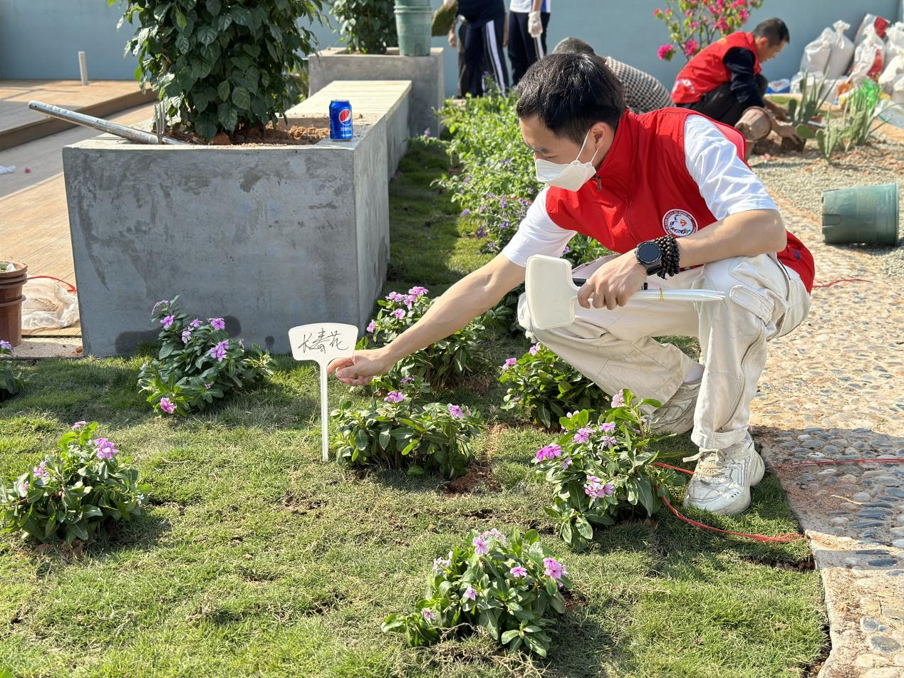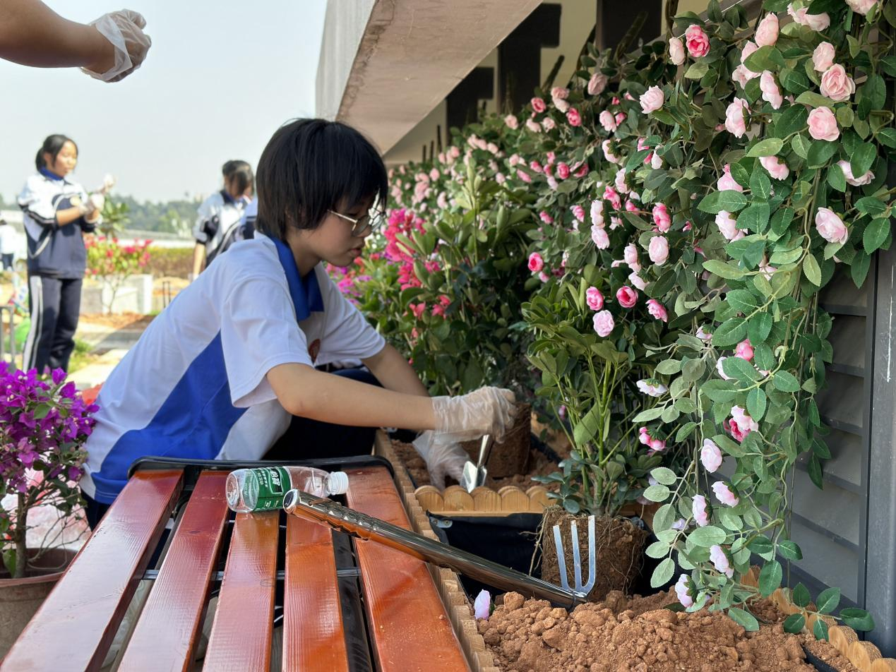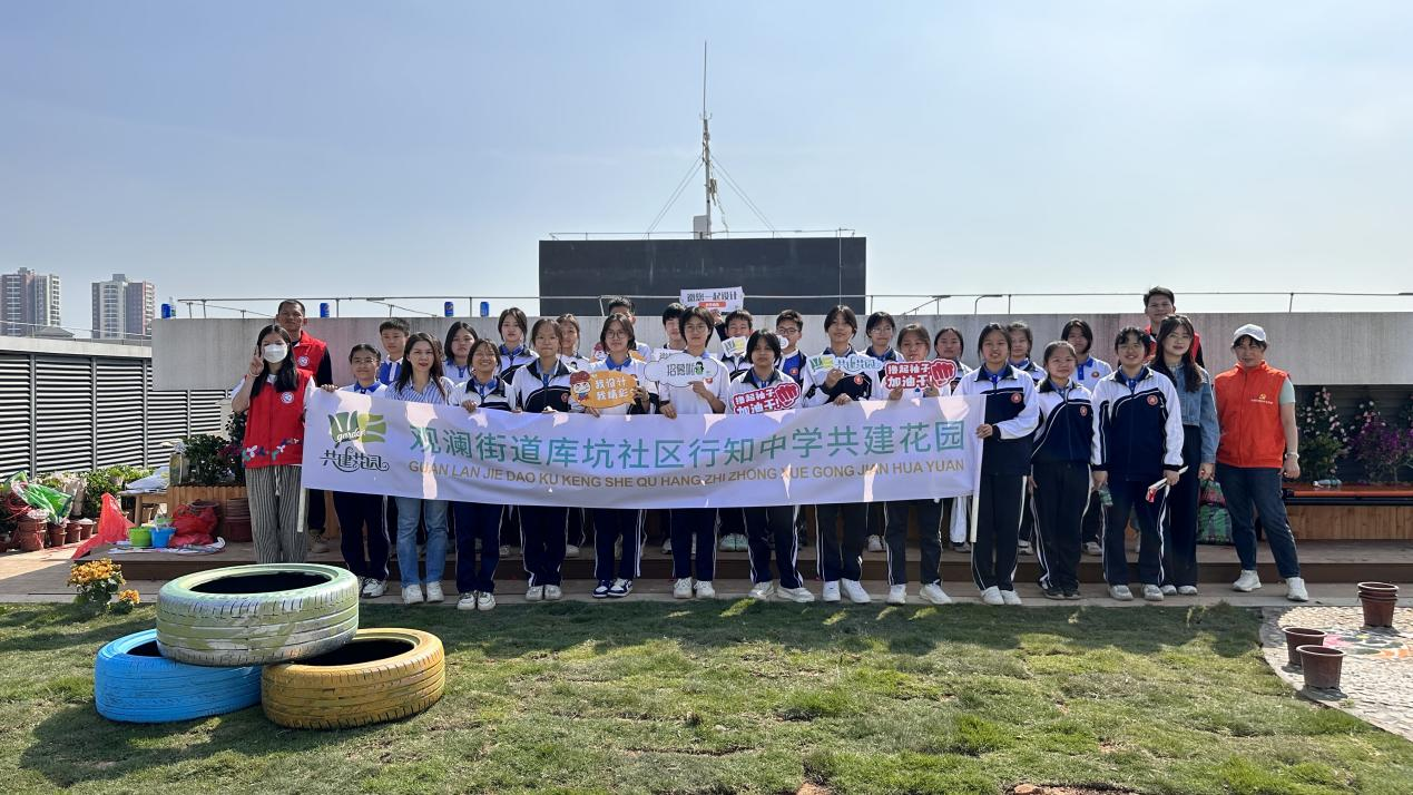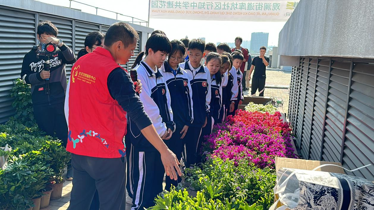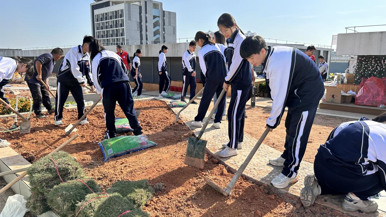 近日,观澜街道联合龙华区城市管理和综合执法局在行知中学校园楼顶开展共建校园建造工作坊,数十名师生、志愿者和绿化工人一起松土、栽花、浇水、培土,共同动手将心中理想花园变为美好的现实。