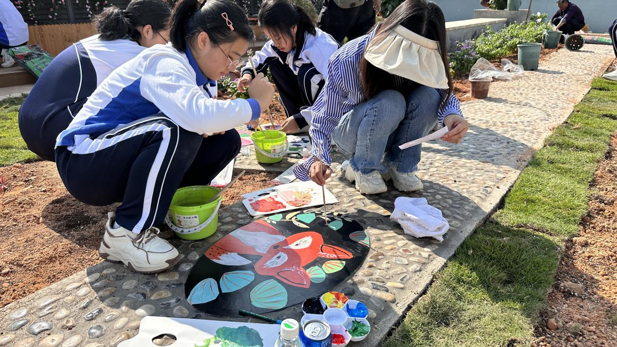 此次共筑花园过程中,充分发挥了学校师生的角色,他们从选址、调研、设计、建造全程参与。在当天的建造过程中,设计老师介绍了此次所需的春夏秋冬花草和摆件后,大家分组开始进行绘画、除草、松土、铺草、浇水,各司其职。