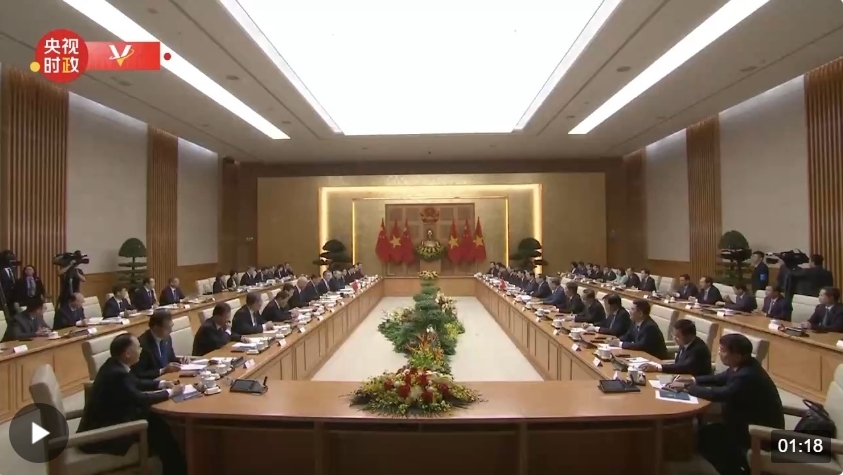 当前,中越关系持续向好发展。昨天,我同阮富仲总书记一道见证双方签署的合作文件,涵盖了两党两国合作的方方面面,充分说明中越关系的广度和深度非同一般。我同阮富仲总书记一道宣布构建具有战略意义的中越命运共同体,开启了新时代中越关系新篇章,相信将为两国人民带来更大福祉,为地区和世界和平、稳定、发展作出积极贡献。