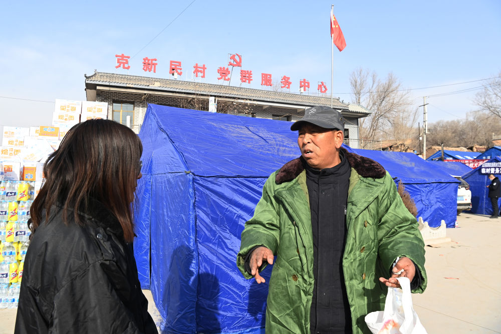 2023年12月22日,在积石山县大河家镇克新民村安置点,党支部书记张辉林(右)给工作人员嘱咐物资分发事项。新华社记者 范培珅 摄