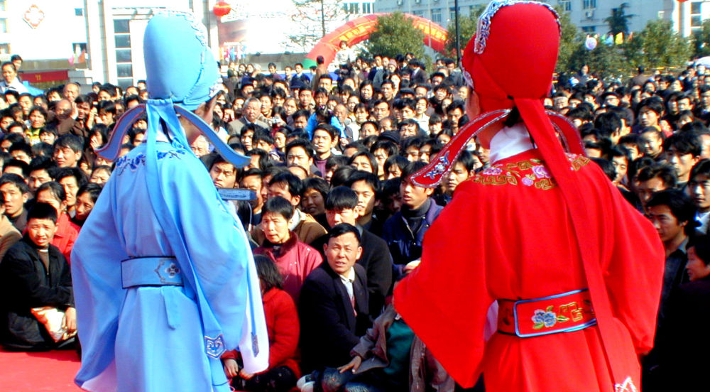 2004年正月初三,在浙江省温州市永嘉县桥下镇六岙村,戏剧演员和群众一同观看台上的精彩表演。