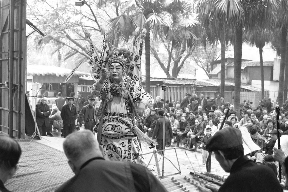 1994年春节前夕,广州越秀区群乐业余戏曲剧团在公园和街头表演粤剧。