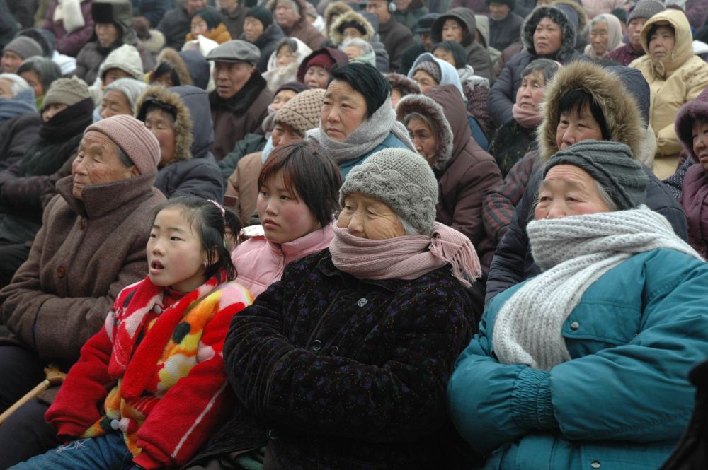 2006年春节期间,河南沁阳紫陵镇紫陵村的村民们在欣赏豫剧演出。
