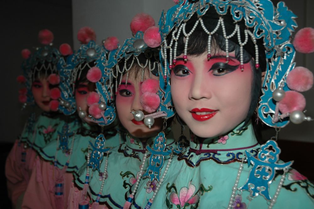 2006年春节期间,河南省沁阳市一文体活动中心中的豫剧演员们在登台表演前做准备。