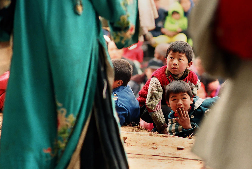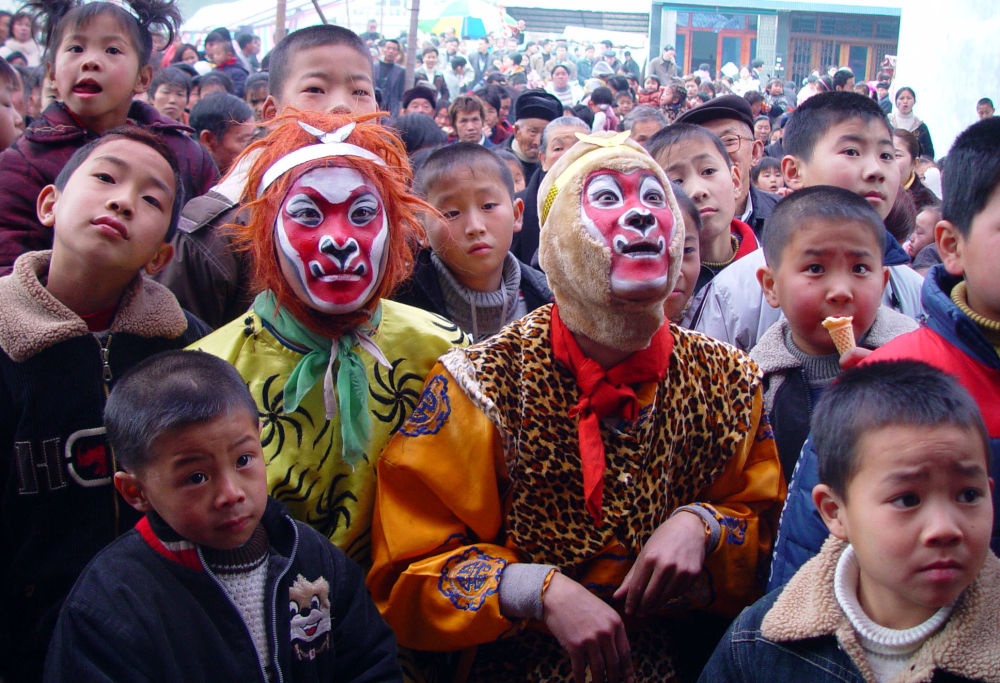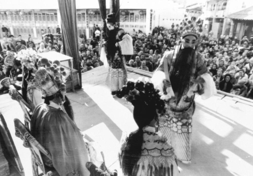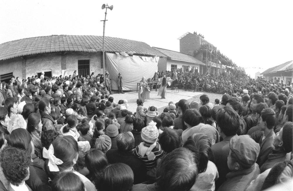1996年春节前,四川彭州市隆丰镇的村民在观看本镇川剧艺人表演。