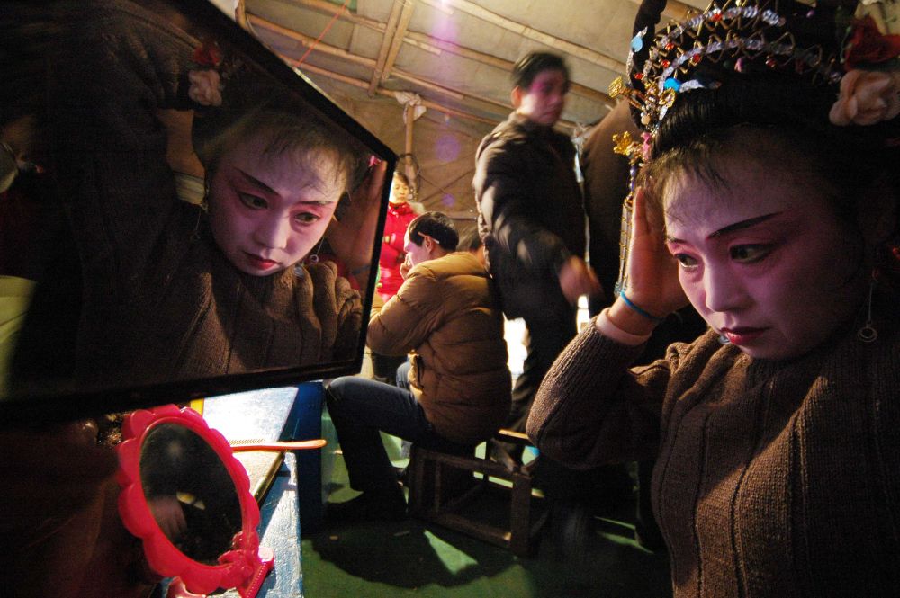 2007年春节期间,安徽芜湖新新庐剧团的演员演出前在后台化装。
