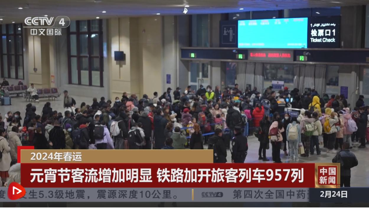 央视网消息:2月24日是元宵节,随着天气逐渐好转,旅游、学生、务工等客流增加,出行需求旺盛。铁路部门加大运力投放,增开旅客列车,公路、民航客流量继续高位运行。