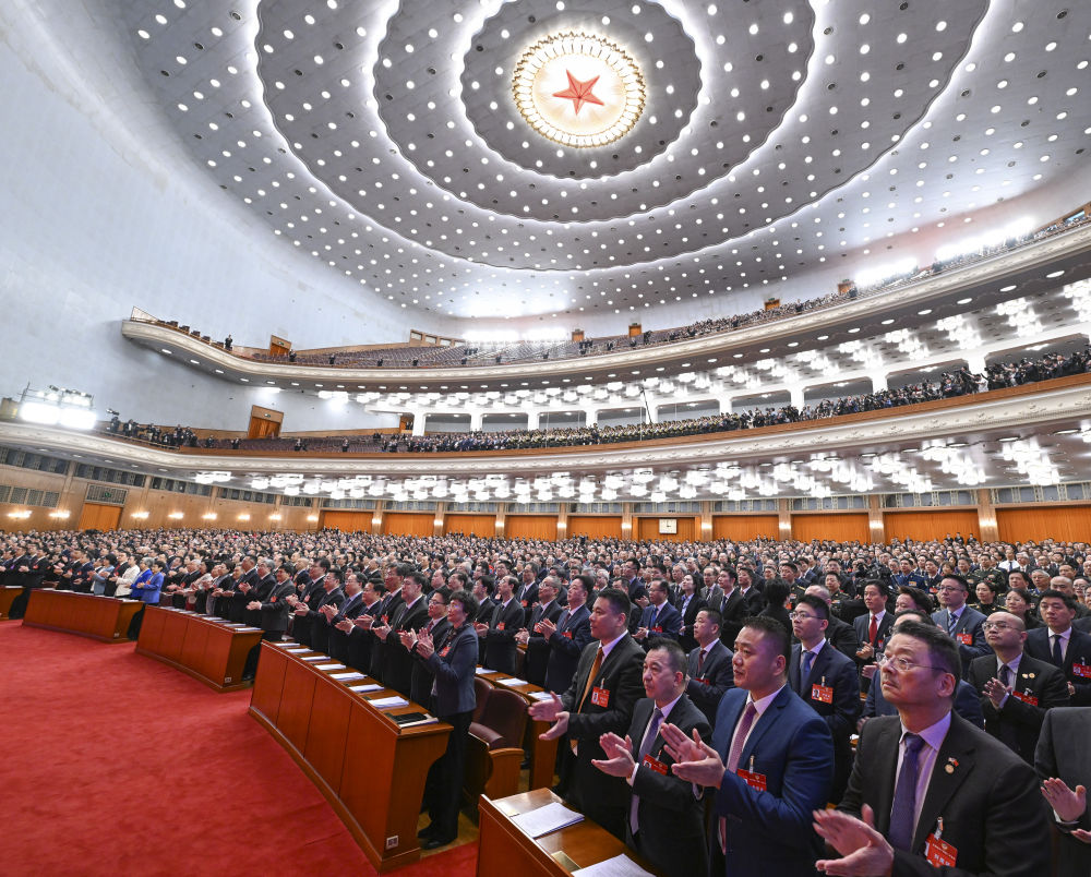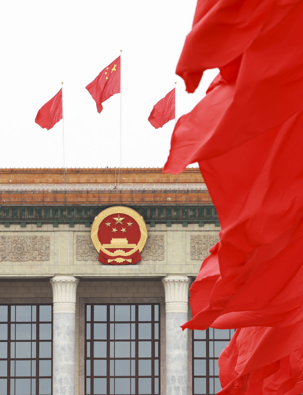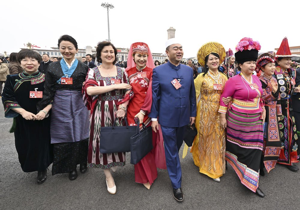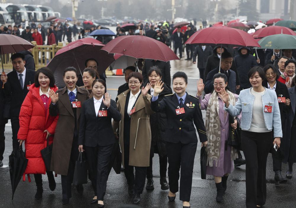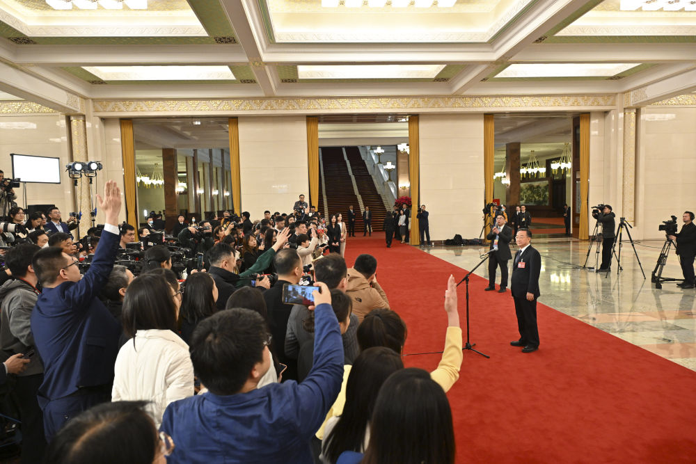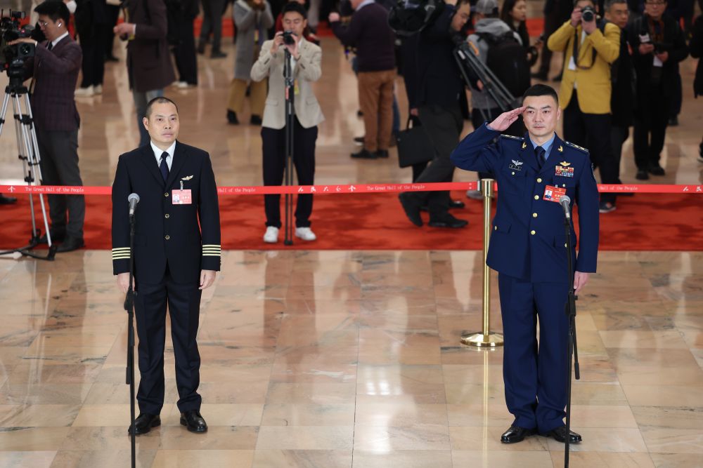3月4日举行的首场“委员通道”集体采访活动上,全国政协委员李庆忠(左)在全国政协委员郑鈜的帮助下准备接受媒体采访。