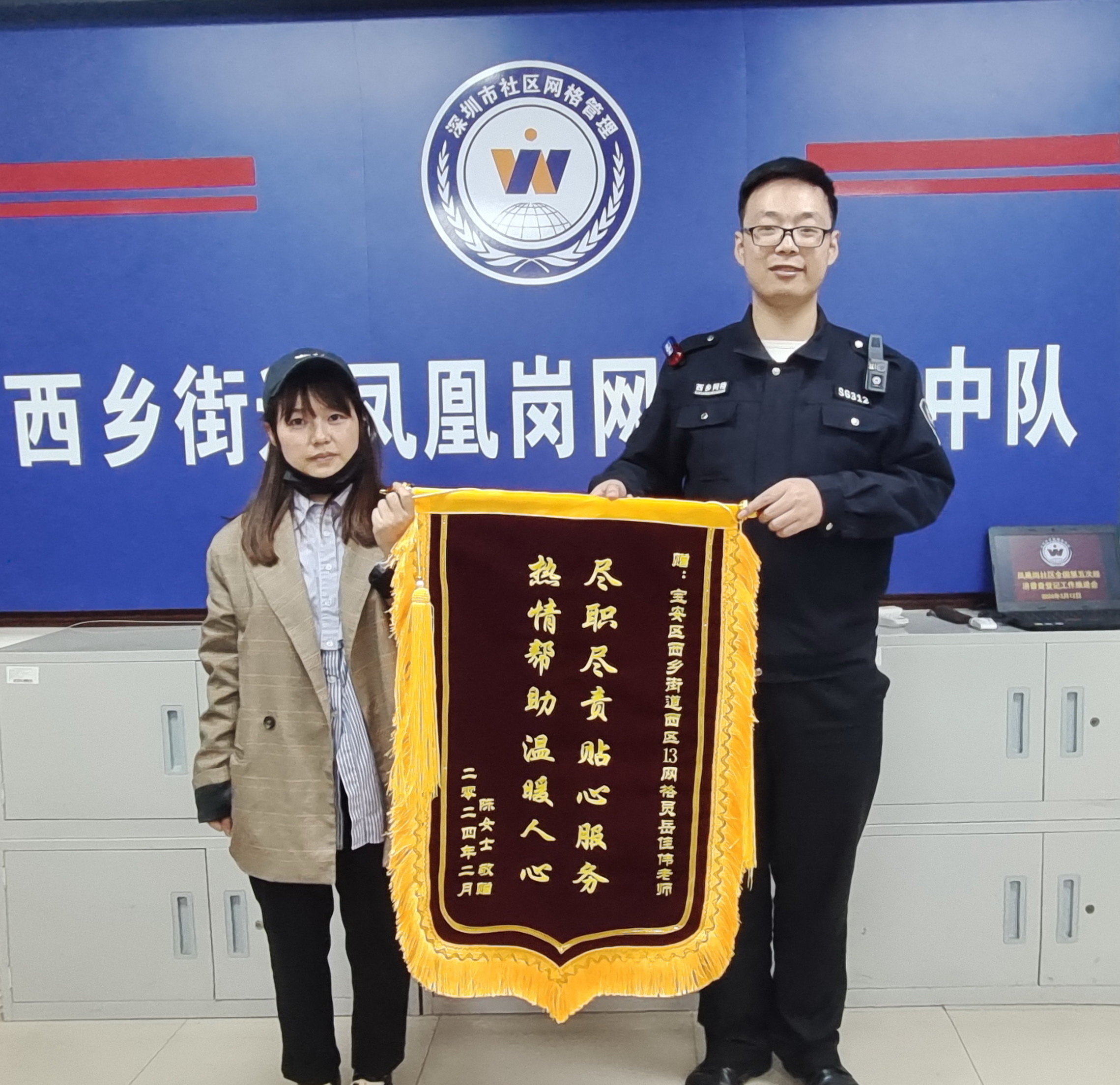 网格无小事,事事暖民心。3月13日晚,西乡街道家住凤凰岗社区的住户陈女士来到凤凰岗网格巡查中队,将一面印有“尽职尽责贴心服务 热情帮助温暖人心”的锦旗送给网格员岳佳伟,向网格员热心服务群众,帮助群众解决燃眉之急表示感谢。