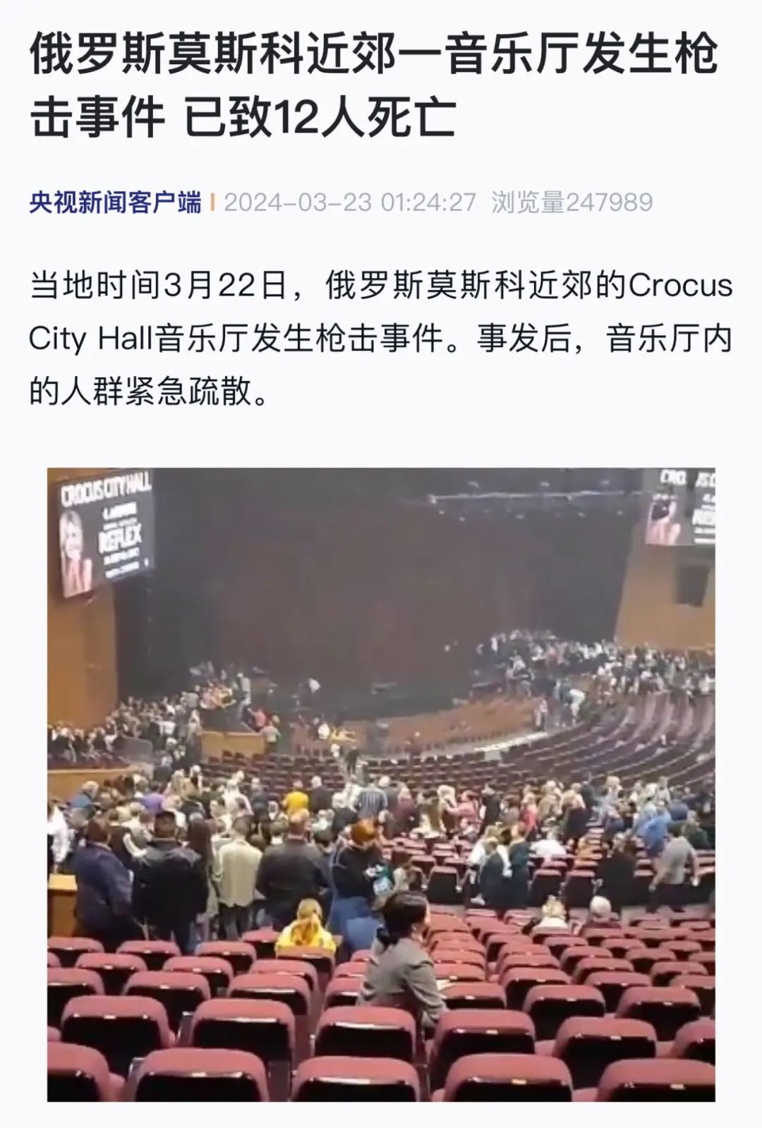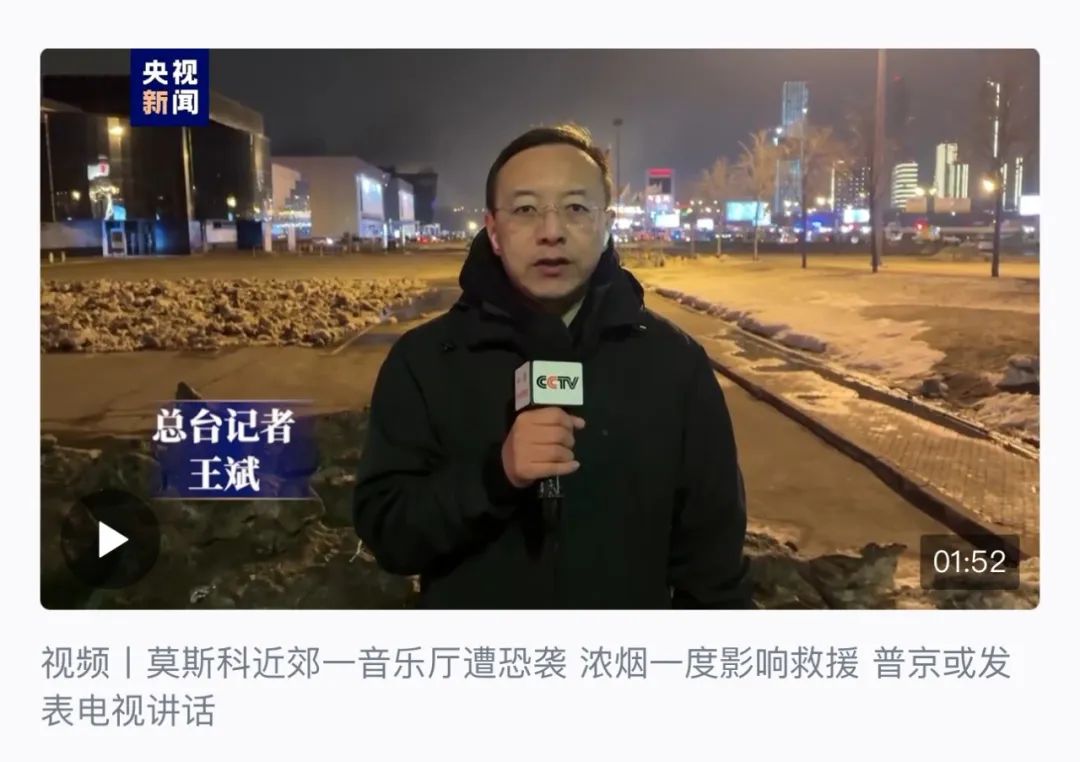 “俄罗斯莫斯科近郊一音乐厅发生枪击事件已致12人死亡”……北京时间3月23日凌晨1:24,一条来自中央广播电视总台央视新闻的突发报道紧急发出,为全球华文媒体首发。此时距事件发生后俄媒今日俄罗斯发出首条报道仅4分钟。