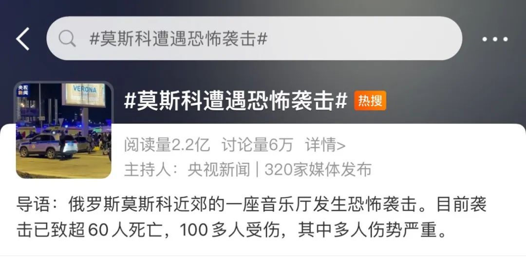 随后,央视新闻不断跟进,为关心现场救援、关注调查结果的各平台网友持续更新事件进展,总计发稿35条,阅读量近2000万。23日12时起,央视新闻客户端开启“正直播”,以直播态方式实时聚焦恐袭现场,全网播放量超1800万。央视新闻共25个微博话题登上热搜,主话题#莫斯科遭遇恐怖袭击#阅读量超2.4亿,相关热搜话题总阅读量12.7亿。