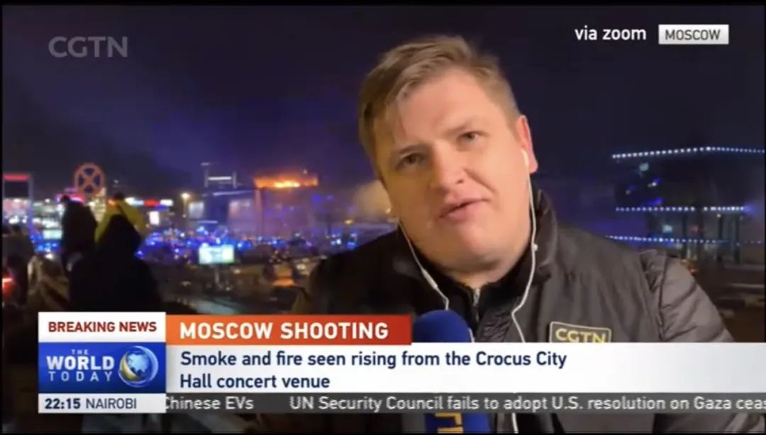 总台CGTN特约报道员Vadim Simakov在现场报道音乐厅恐袭发生后,莫斯科暂停公共活动,学校商场关闭。