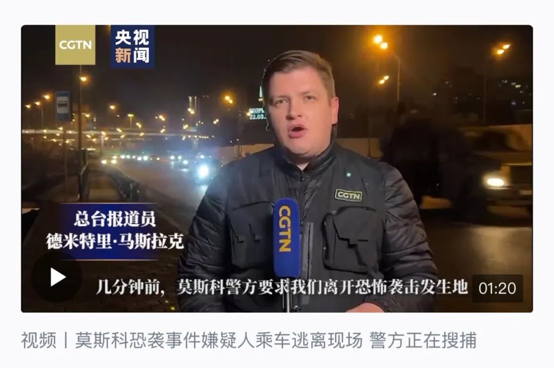 恐怖袭击现场,伤亡和救援情况究竟如何?调查是否有了新进展?事件发生后不到一小时,总台CGTN俄语报道员德米特里·马斯拉克发回了第一条独家视频,记录自己开车赶往事发现场途中所见。