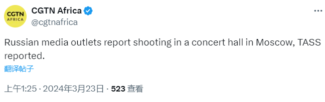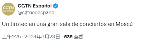 北京时间3月23日凌晨,CGTN非洲分台新媒体通过监看多个推特账号及推特趋势注意到莫斯科一音乐厅有枪击事件发生,随后跟进关注俄新社及塔斯社两家主流媒体的报道,在塔斯社俄语官网报道相关消息后,于北京时间1:25将消息发布于推特平台。与此同时,CGTN西班牙语快反团队在俄罗斯本地信源中注意到突发恐袭的消息,经与俄媒今日俄罗斯消息比对核实后,于1:25在西语官方推特账号发布该消息。