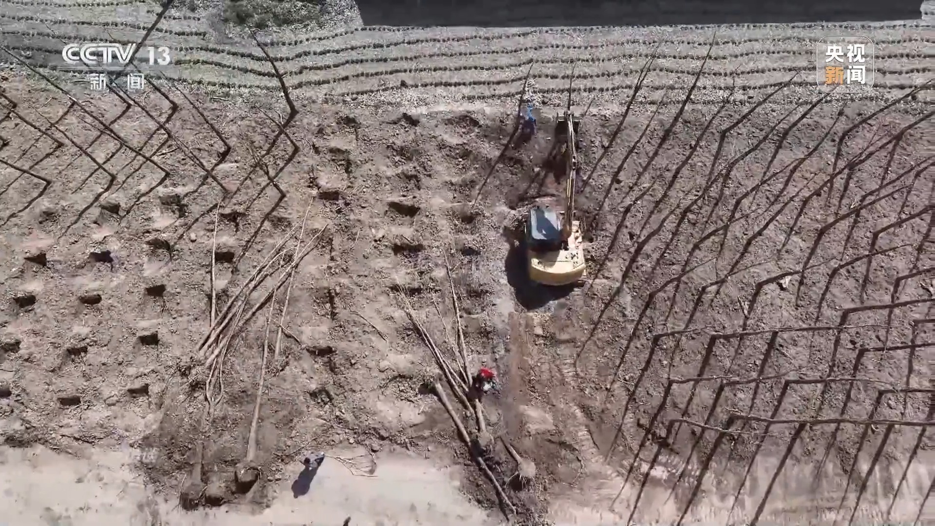 内蒙古巴彦淖尔市临河区国营新华林场副场长 葛文斌:我们是利用高压水枪打孔种植,利用水的压力在沙地里面冲开一个孔洞,然后把梭梭栽到里面。水冲下去以后形成一个球状的沙泥状,把梭梭放到里面以后,根部起到保护作用,提供充足的水分。
