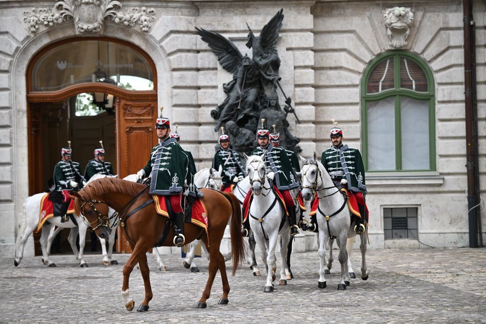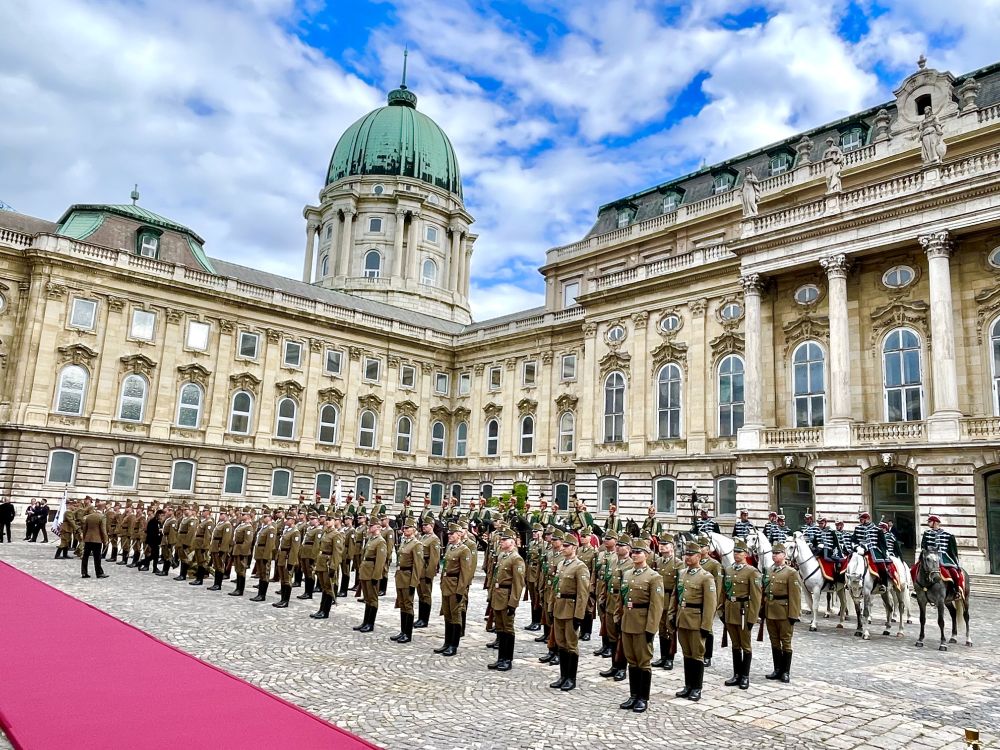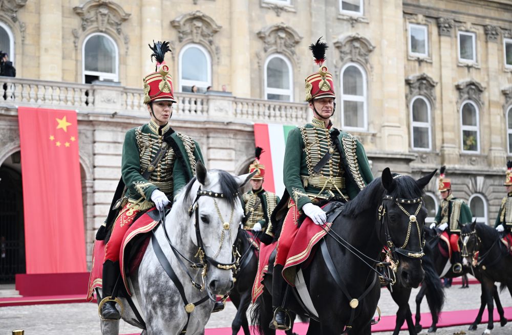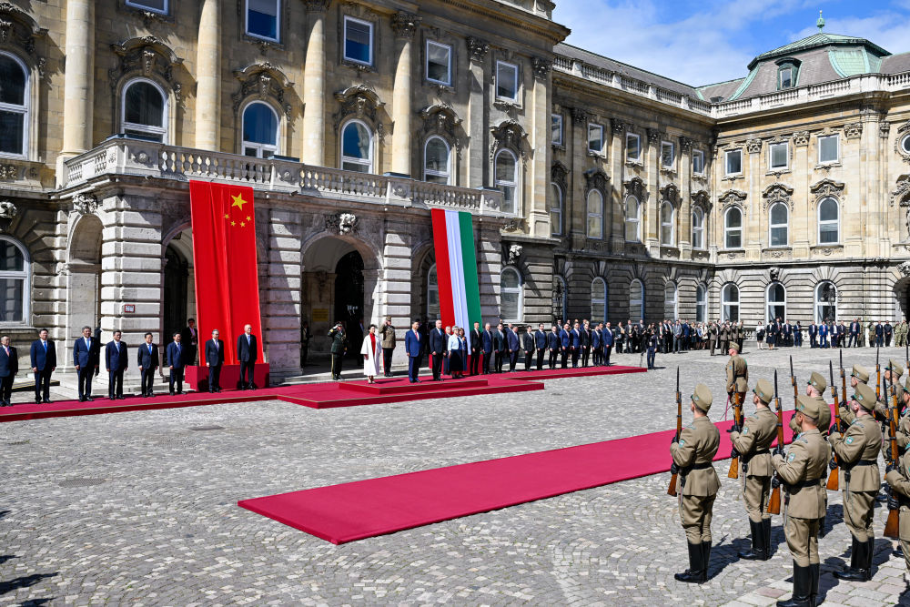 初夏时节的布达佩斯阳光明媚,古老宏伟的布达王宫庄严矗立,中匈两国国旗相映成辉。习近平和夫人彭丽媛乘坐的国宾车队在匈牙利礼宾马队护卫下缓缓驶入布达王宫内庭。舒尤克总统夫妇和欧尔班总理夫妇热情迎接。