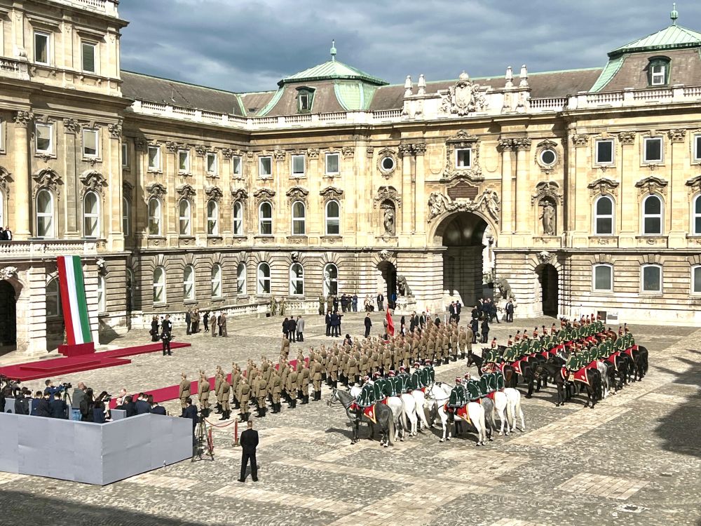 当地时间5月9日上午,国家主席习近平在布达佩斯出席匈牙利总统舒尤克和总理欧尔班共同举行的隆重欢迎仪式。习近平在舒尤克陪同下检阅国防军仪仗队和骑兵仪仗队。