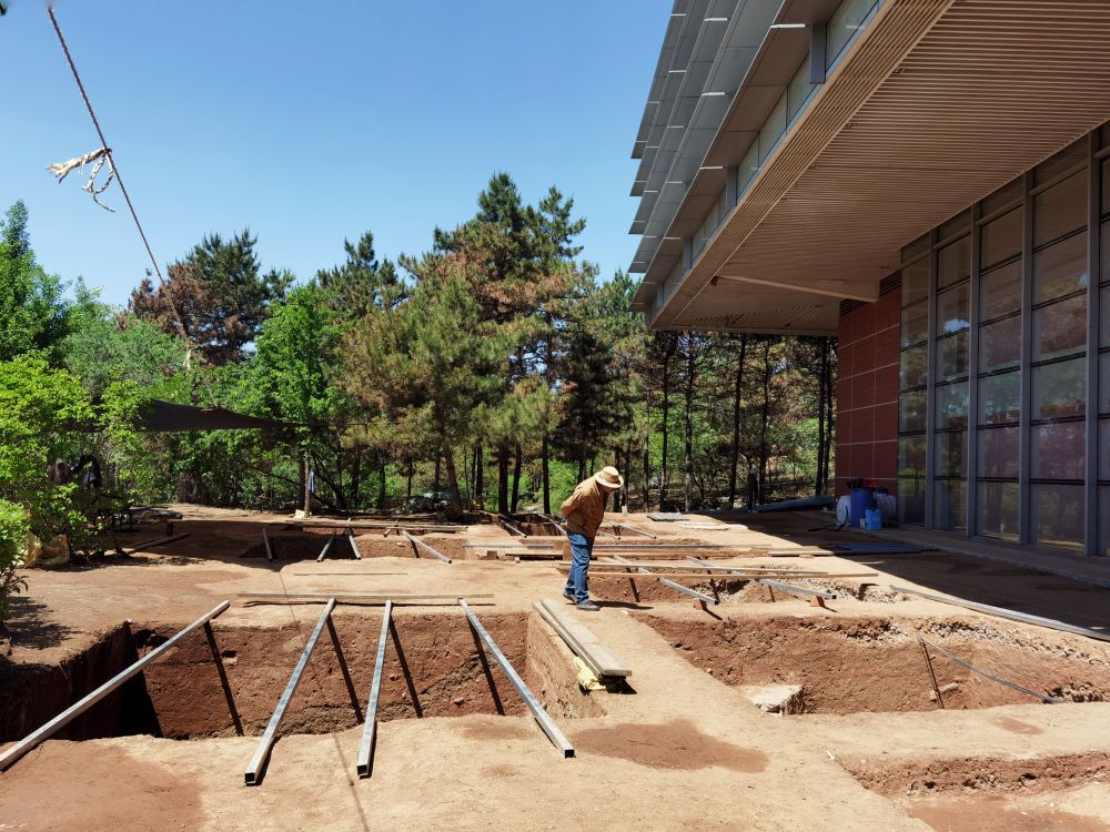 辽宁朝阳牛河梁遗址第一地点(女神庙)保护展示馆外,中国社科院考古所世界考古研究室主任、牛河梁遗址发掘领队贾笑冰和辽宁省文物考古研究院研究馆员郭明正带领队员进行田野考古工作。