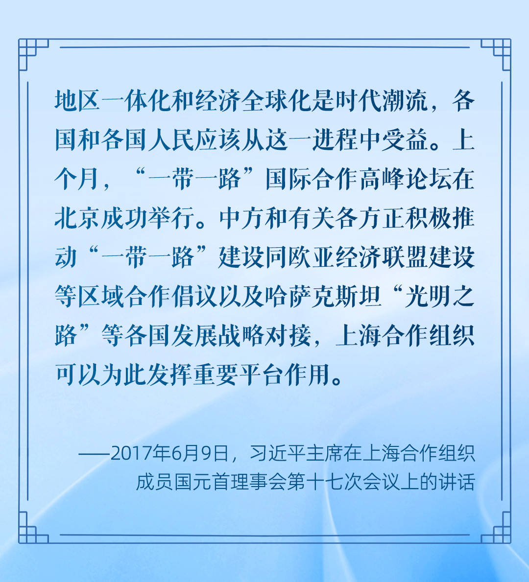 在上海合作组织这个世界上人口最多、幅员最辽阔的大家庭,好邻居心连心、好朋友肩并肩、好伙伴手牵手,不断拓展互利合作、共同发展的广阔空间,朝着实现现代化的宏伟蓝图,在可持续发展之路上不断迈进。