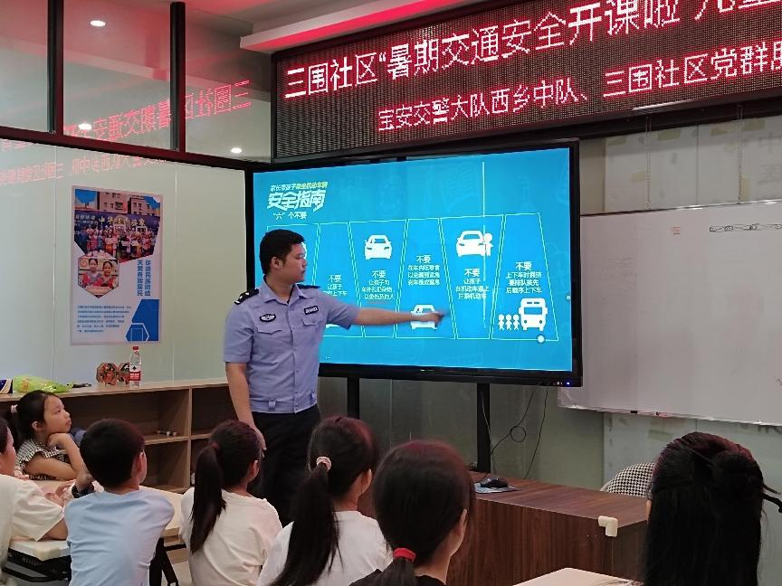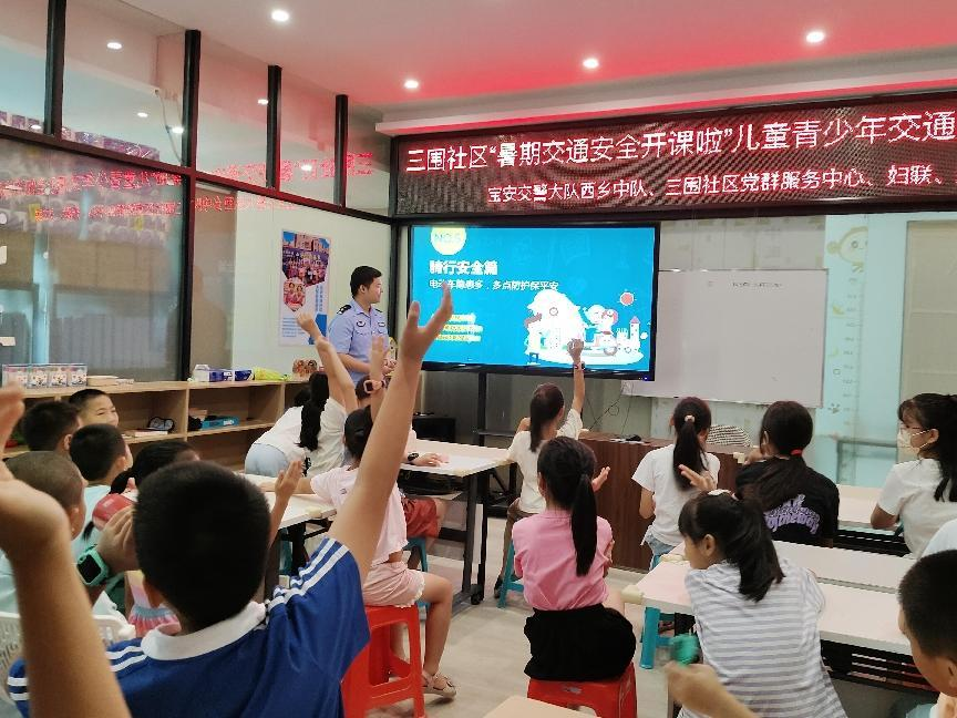 为了提升辖区儿童青少年交通安全意识,助力孩子们度过安全愉悦的暑假,7月11日上午,深圳市宝安区航城街道三围社区开展了儿童青少年交通安全知识讲座。本次讲座特别邀请了宝安交警大队西乡中队航城警务区符睿丰警长作为主讲人,为参与的30位孩子上了一堂生动有趣的交通安全教育课。