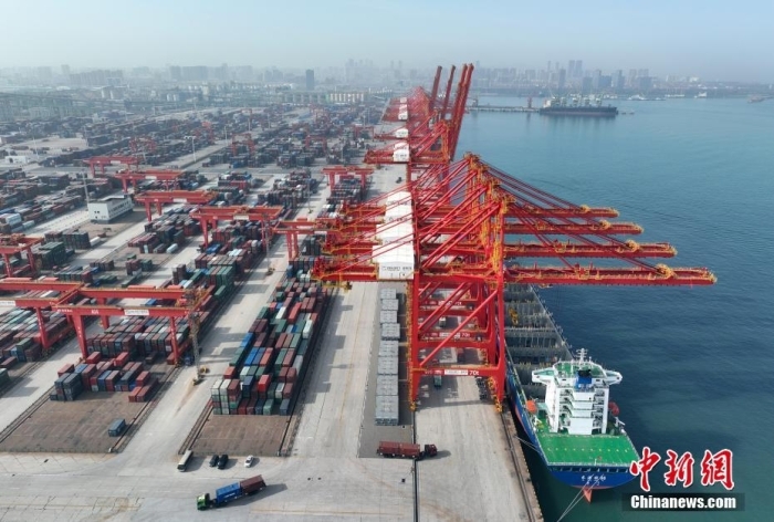 资料图:山东日照港全自动化集装箱码头作业现场。(无人机图片)中新社记者 毛建军 摄