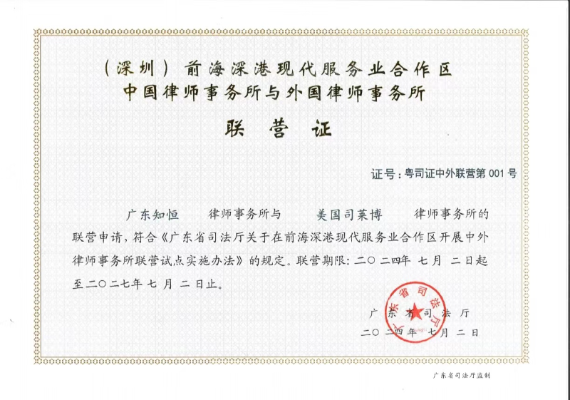 近日,前海合作区迎来了法律服务业的又一里程碑事件。经广东省司法厅审批同意,广东知恒律师事务所美国司莱博律师事务所前海联营办公室在前海合作区设立,标志着前海在法律服务业对外开放和国际合作领域又迈出了重要一步。