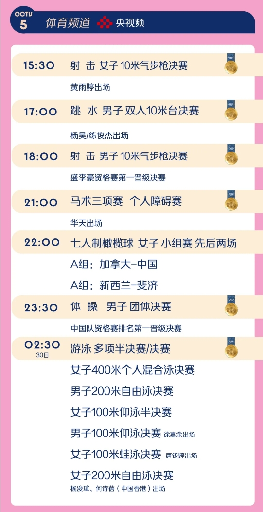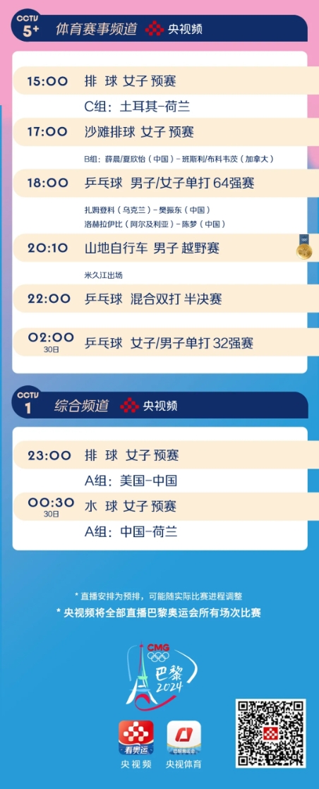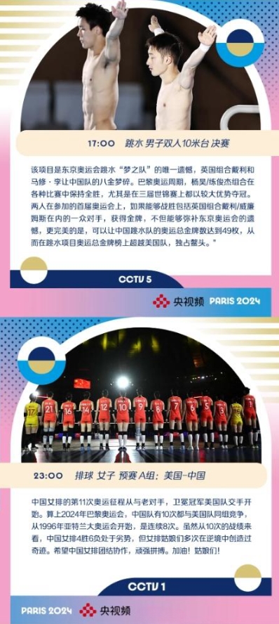第三个比赛日(29日)将产生19枚金牌。中国女排将首秀巴黎奥运会赛场,中国射击、跳水、体操等项目将对金牌发起冲击。