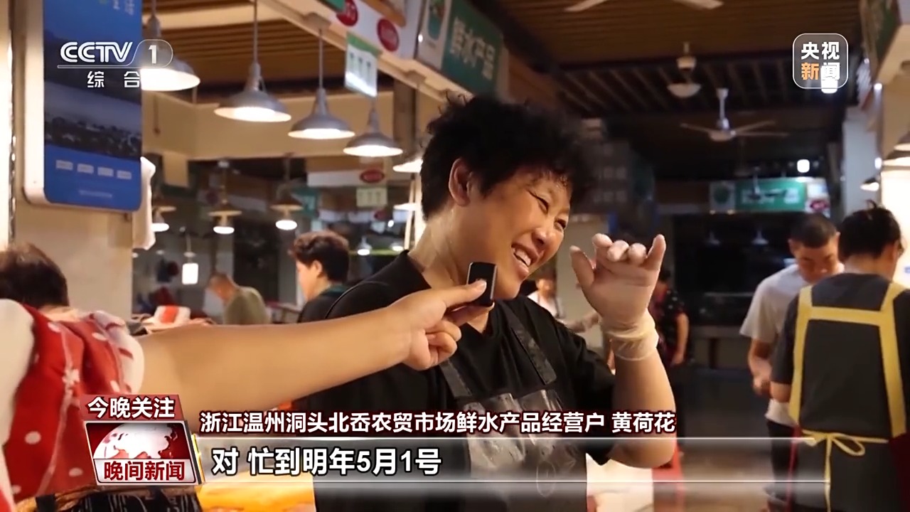 浙江温州洞头北岙农贸市场鲜水产品经营户 黄荷花:对,忙到明年5月1日,蛮开心的,有钱赚。