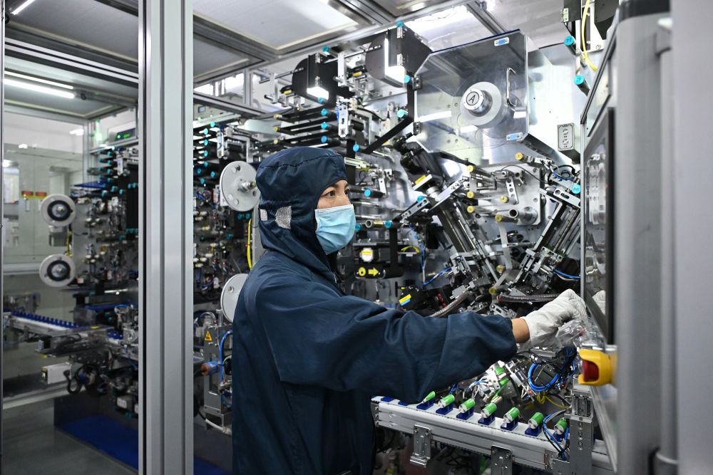 7月31日,华阳新材料科技集团华钠芯能科技有限责任公司的工作人员在圆柱电芯制片卷绕机上操控设备运行。新华社记者 李鑫 摄