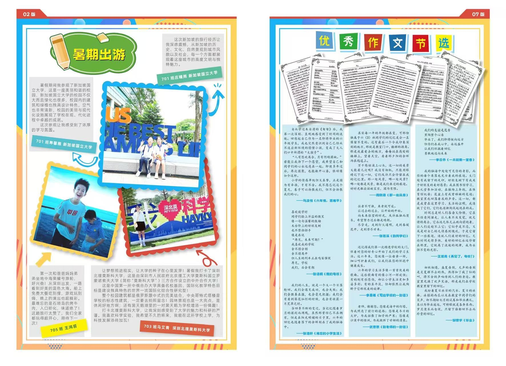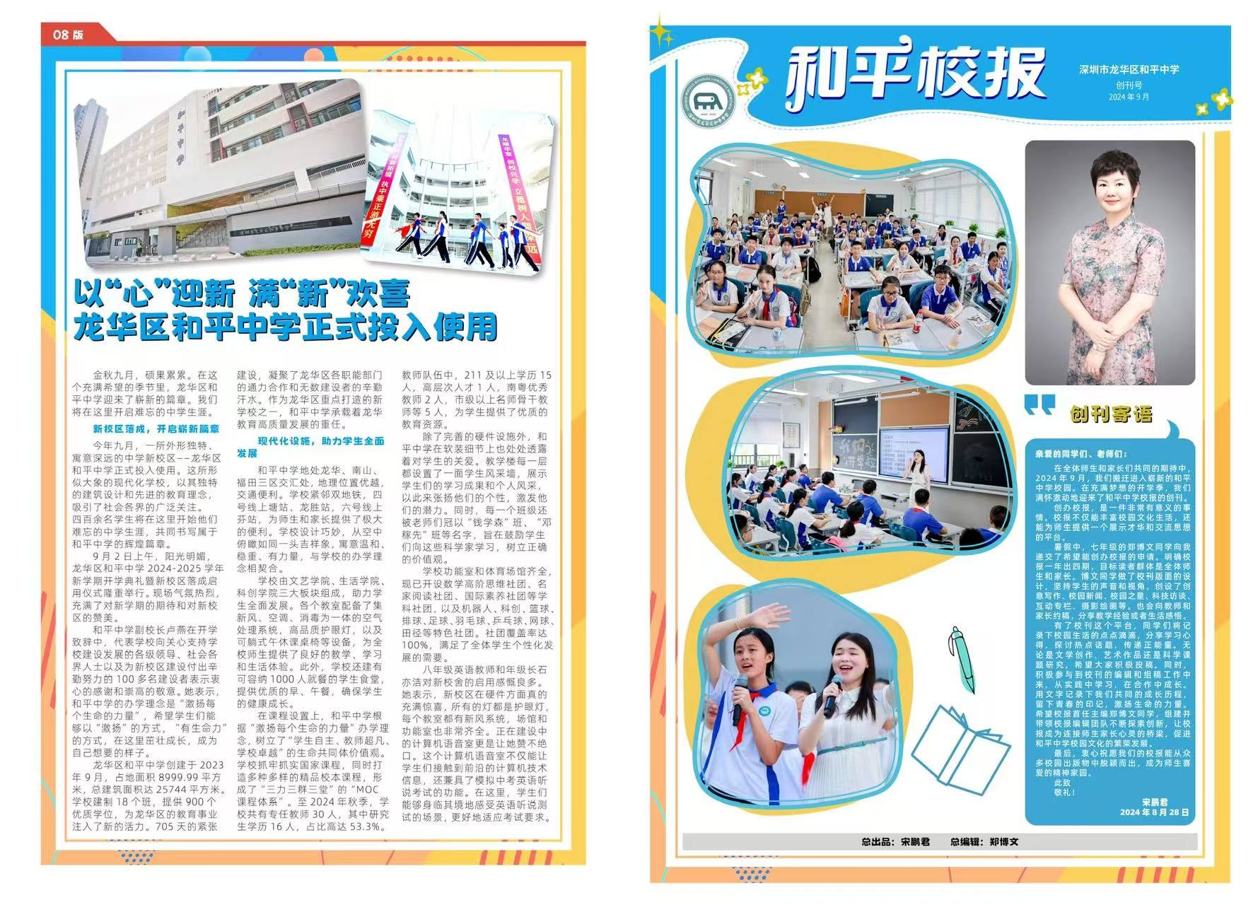 “暑假中,七年级的郑博文同学向我递交了希望能创办校报的申请。博文同学做了首期校刊版面的设计,坚持学生的声音和视角,创设了创意写作、校园新闻、校园之星、科技访谈等。后续也会向教师和家长约稿,分享教学经验或者生活感悟。”龙华区和平中学校长宋鹏君表示,有了校刊这个平台,同学们将记录下校园生活的点点滴滴,分享学习心得,探讨热点话题,传递正能量。无论是文学创作、艺术作品还是科学课题研究,希望和平中学的同学们积极投稿。同时,积极参与到校刊的编辑和组稿工作中来,从实践中学习,在合作中成长。用文字记录下成长历程,留下青春的印记,激扬生命的力量。