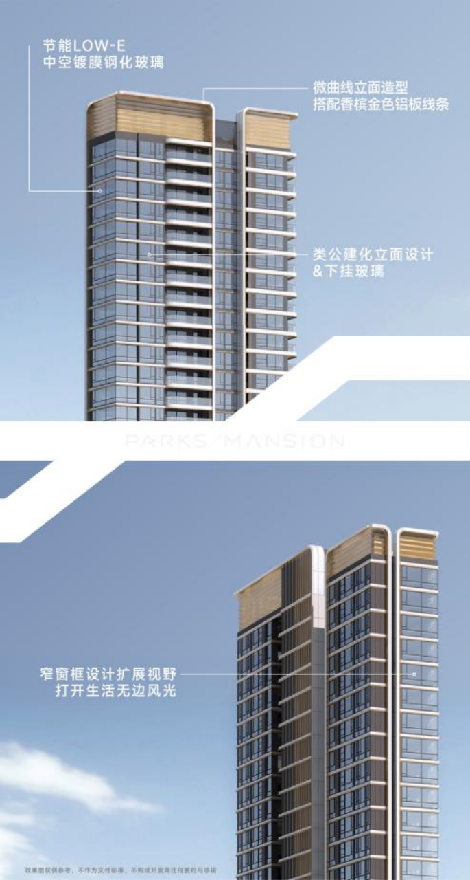 四海臻邸二期,将设计回归生活的本质,营造丰盈又纯粹的居家视感,让于此的生活成为蛇口高阶居住的独特符号。项目建筑外立面采用微曲线立面造型,搭配香槟金色铝板线条,类公建化立面设计&下挂玻璃,展现现代建筑的圆润与前卫,同时采用节能LOW-E中空镀膜钢化玻璃,窄窗框设计扩展视野,打开生活无边风光。