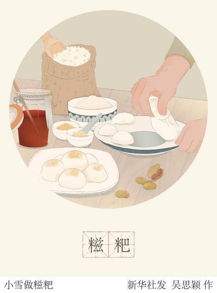 小雪轻扬,银装初上,冬天的景致格外美丽,这一时节的民俗活动也是丰富多样的。华东师范大学民俗学研究所教授田兆元介绍,比如吃糍粑、腌腊肉、酿小雪酒等。“其中,吃糍粑,是源于春秋战国时期的风俗,相传伍子胥在建城时将糯米蒸熟压制成砖块,然后放冷,既可以当城墙基石,又能抵御粮荒,后来就成了南方地区一项民俗。”