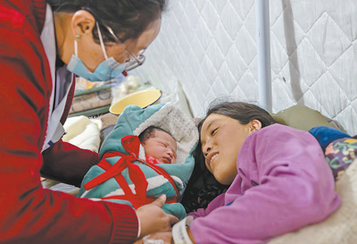 1月10日,日喀则市定日县人民医院妇产科医生在照看一对母子。这名新生儿在9日刚刚出生。本报记者 张武军摄