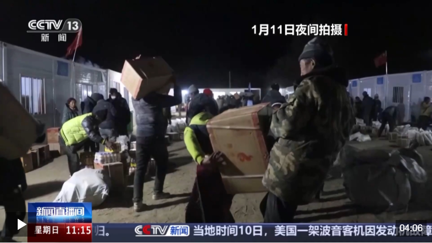这里是长所乡古荣村活动板房安置点,在11日晚9:23,户外温度零下3℃。虽然天气寒冷,但院子里非常热闹,安置群众领到了发放的米、面,还有糌粑等生活必需物品。