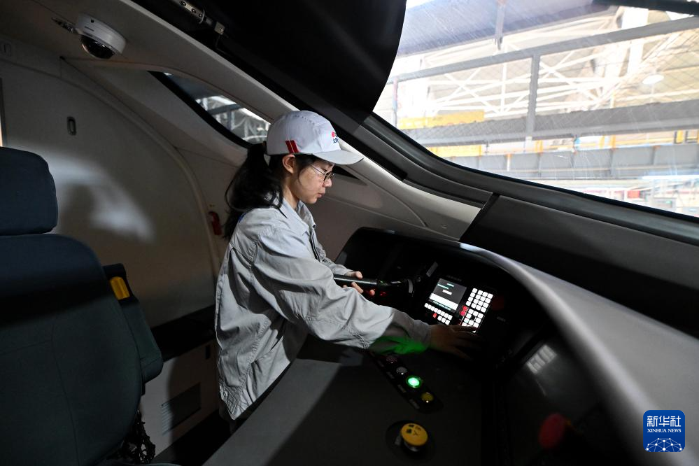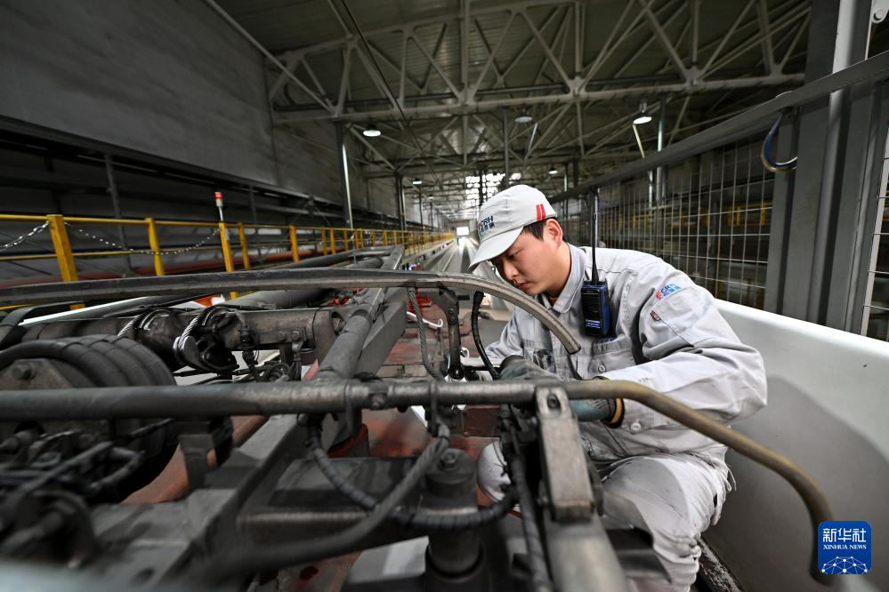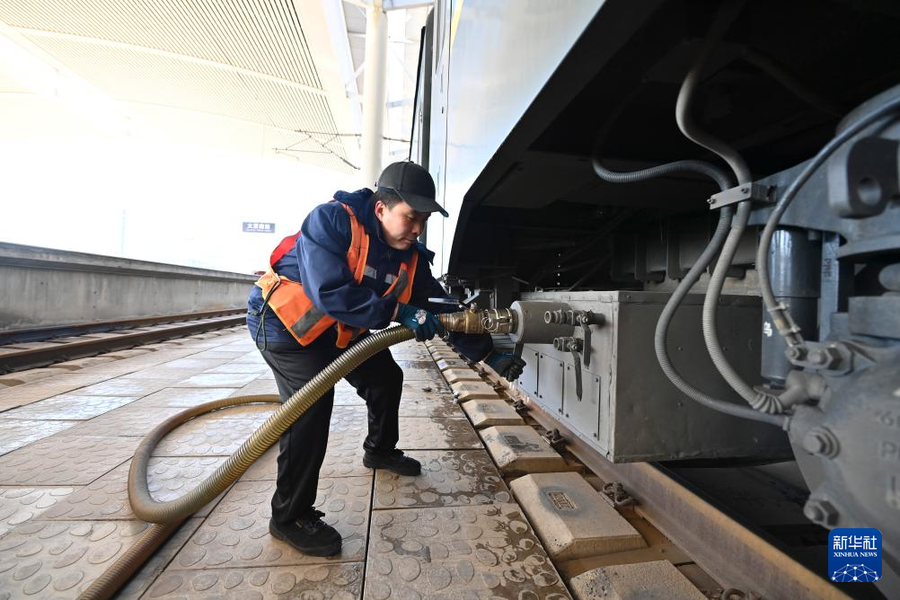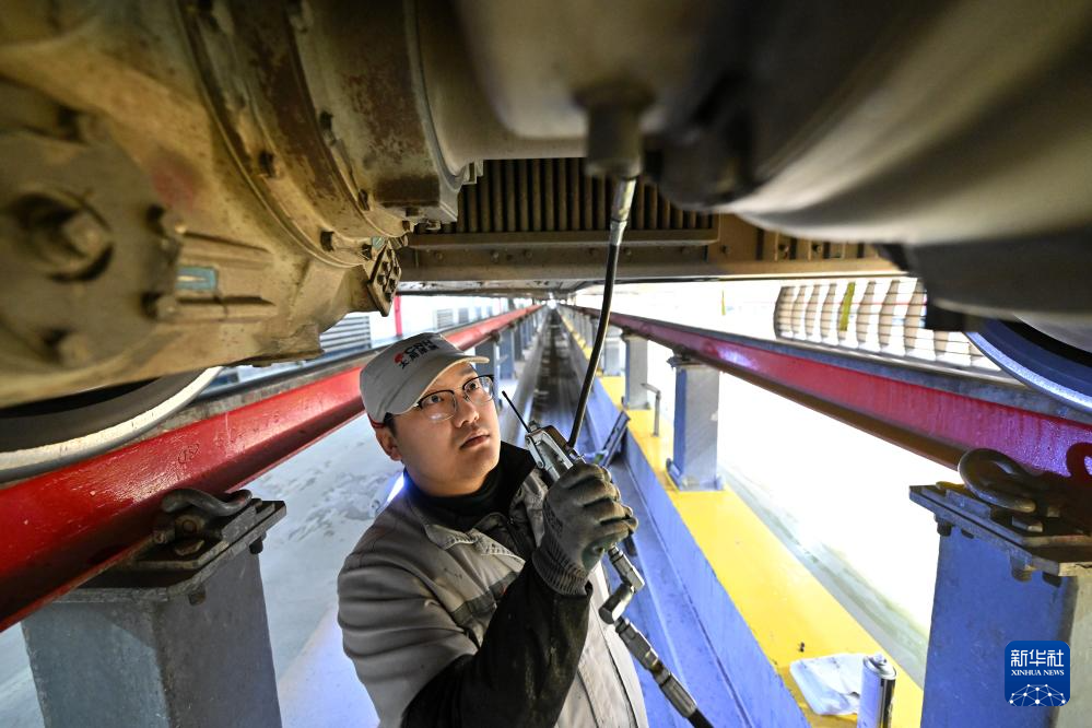动车组机械师党子淳在太原动车组运用所对列车进行检查维护(1月9日摄)。